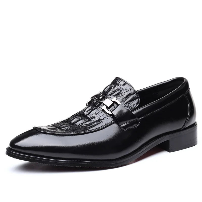 Crafted from polished premium leather, the Axton Croc Loafer features a smooth almond-toe silhouette accented with a croc-embossed vamp and metal horsebit detail. Paired with a low-profile dress sole and structured slip-on form, it delivers a bold formal presence with a refined edge.